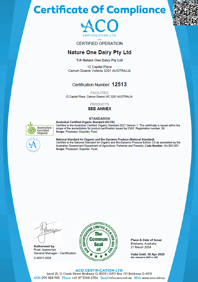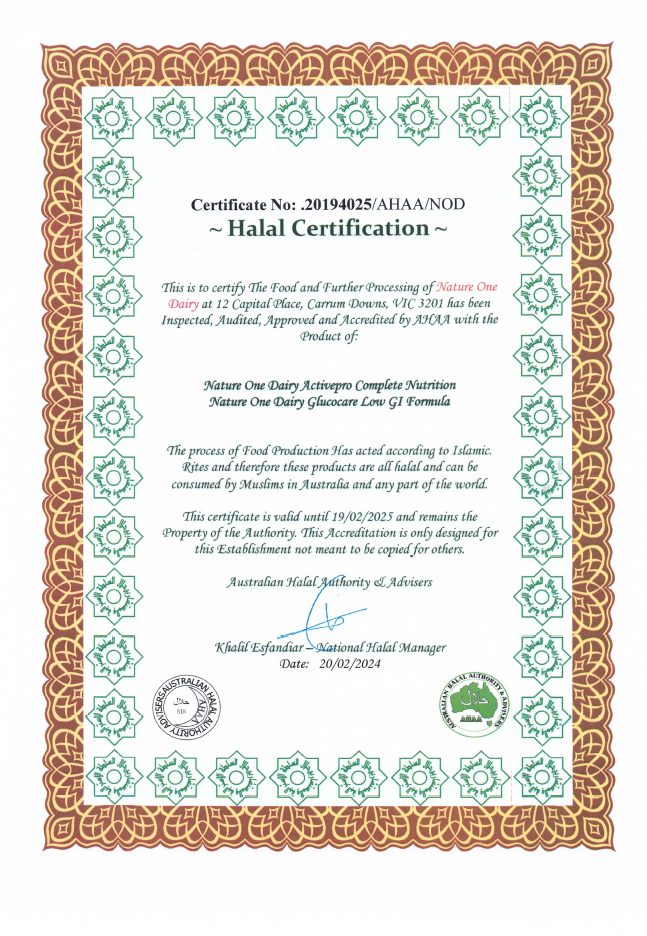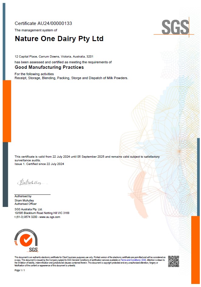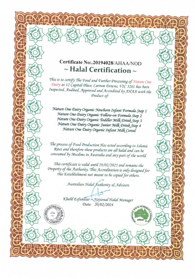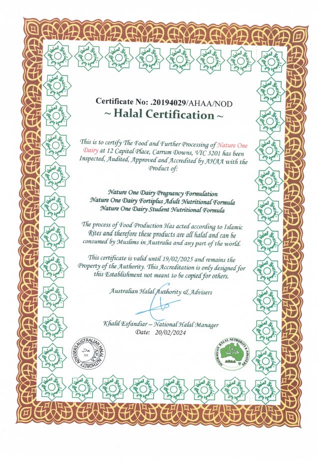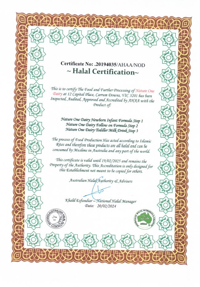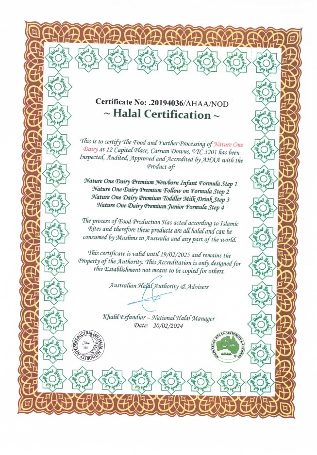 Nature One Dairy Pty Ltd is certified by the Department of Agriculture to be an Export Registered Establishment (Establishment No. 1879) as having achieved standards in good hygienic practice, HACCP (Hazard Analysis Critical Control Point), product integrity and importing country requirements. We are also a licensed facility by the Dairy Food Safety Victoria (DFSV). We have also been certified by the Australian Halal Authority & Advisers (A.H.A.A) for purpose of Halal food export from Australia.