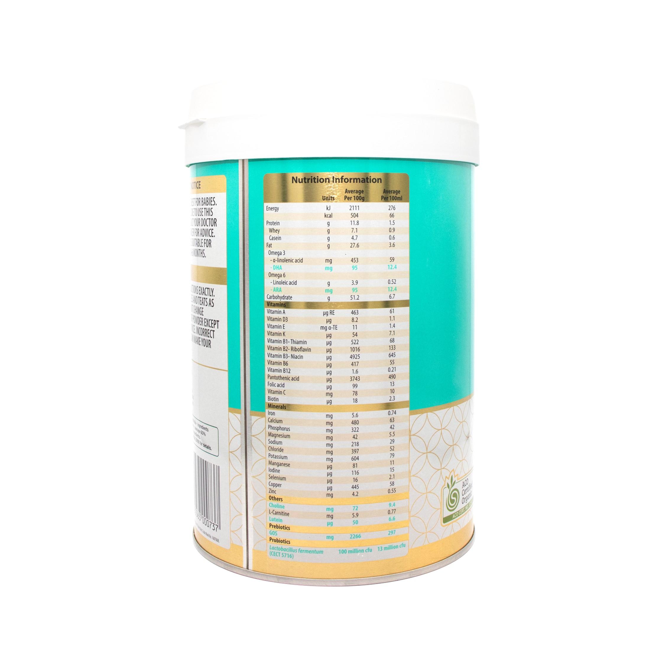 有机全脂奶,有机乳糖,有机混合植物油(高油酸葵花籽油,大豆油,椰子油,菜籽油),有机浓缩乳清蛋白,有机低聚半乳糖(GOS, 来自牛奶),矿物质 (磷酸氢二钾,碳酸钙,磷酸氢钙,氯化钠,氯化镁,氯化钾,柠檬酸钠,硫酸亚铁,硫酸锌,硫酸铜,硫酸锰,碘化钾,亚硒酸钠),二十二碳六烯酸(DHA, 取自鱼油), 花生四烯酸(ARA),有机大豆磷脂,维生素(抗坏血酸钠,dl-α-醋酸生育酚、醋酸维生素 A 、烟酰胺、泛酸钙、胆钙化醇、氰钴胺、植物甲萘醌、盐酸硫胺素、盐酸吡哆醇、叶酸、生物素)、L-半胱氨酸单盐酸盐、氯化胆碱。