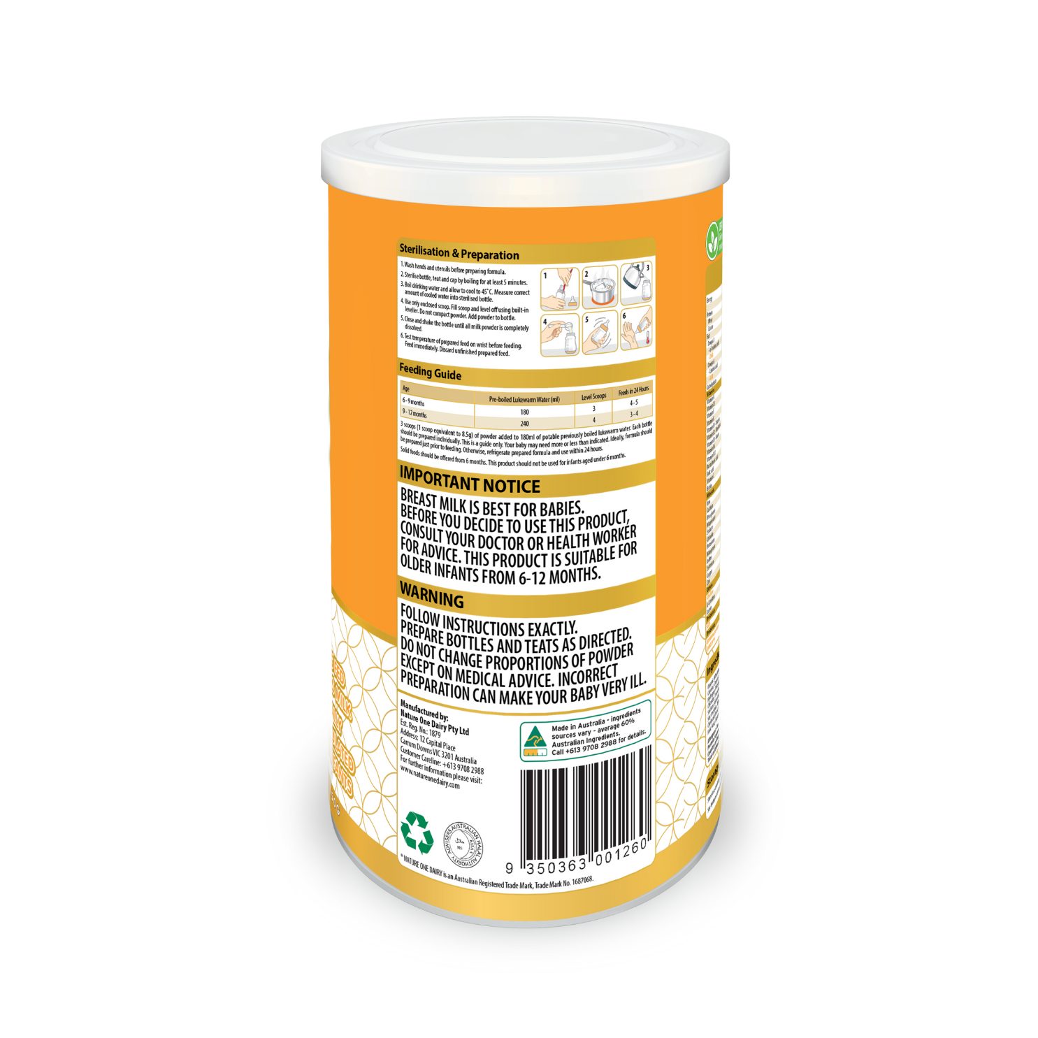 Organic Wholemilk, Organic Skimmilk, Organic Lactose, Organic Vegetable Oil blend (High Oleic Sunflower, Soy, Coconut, Canola), Organic Whey Protein Concentrate, Organic Galacto-Oligosaccharides (GOS from Milk), Minerals (Dipotassium Hydrogen Phosphate, Calcium Phosphate, Calcium Carbonate, Calcium Carbonate, Calcium Hydrogen Phosphate, Sodium Chloride, Magnesium Chloride, Potassium Chloride, Trisodium Citrate, Ferrous Sulphate, Zinc Sulphate, Copper Sulphate, Manganese Sulphate, Potassium Iodide, Sodium Selenite), Docosahexaenoic acid (DHA, from fish oil), Organic Skimmlk POwder, Arachidonic acid (ARA), Organic Soy Lecithin, Vitamins (Sodium ascorbate, L-Ascorbic Acid, dl-alpha-TocopherylAcetate, Vitamin A Acetate, Niacinamide, Cholecalciferol, Calcium Pantothenate, Cyanocobalamin, Thiamine Hydrochloride, Pyridoxine Hydrochloride, Phytonadione, Folic Acid, Biotin), L-Cysteine Monohydrochloride, Choline Chloride, Bifidobacterium Lactis (HN019™), Lutein.