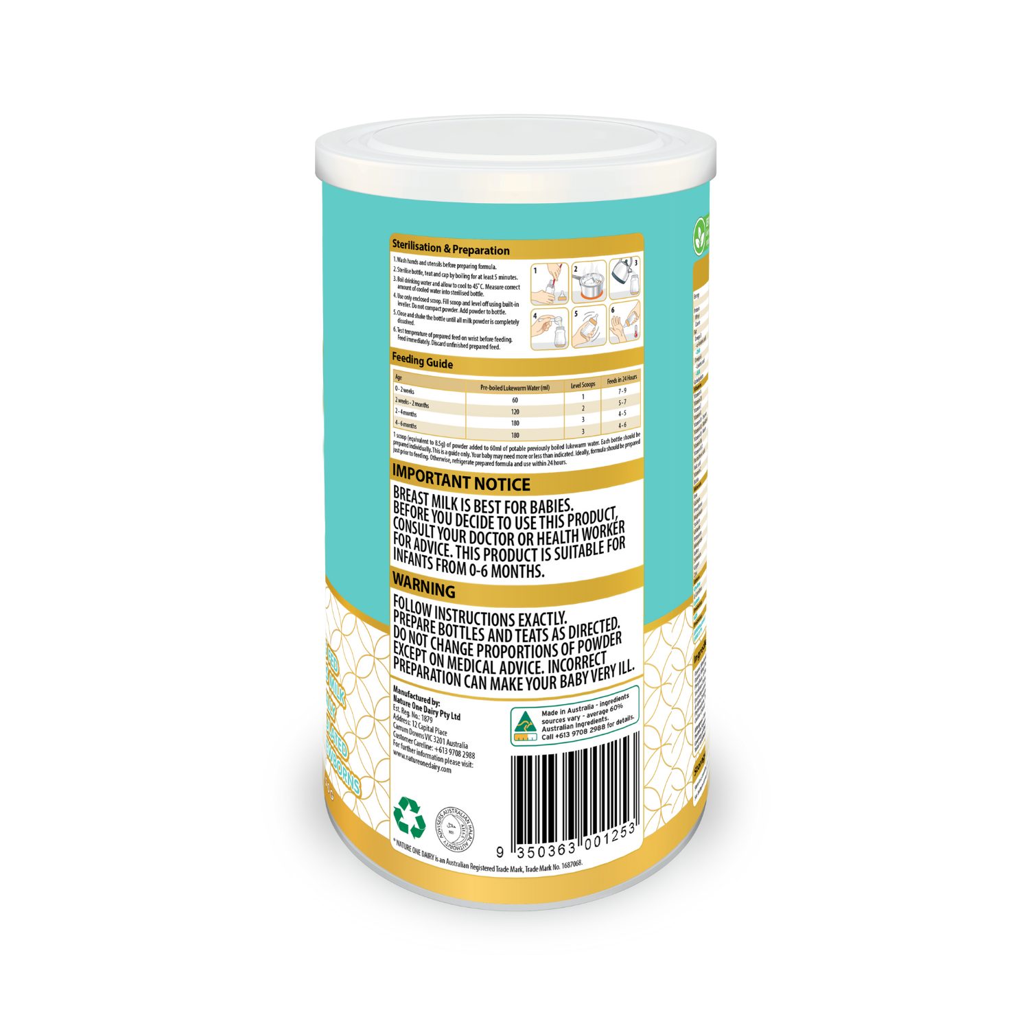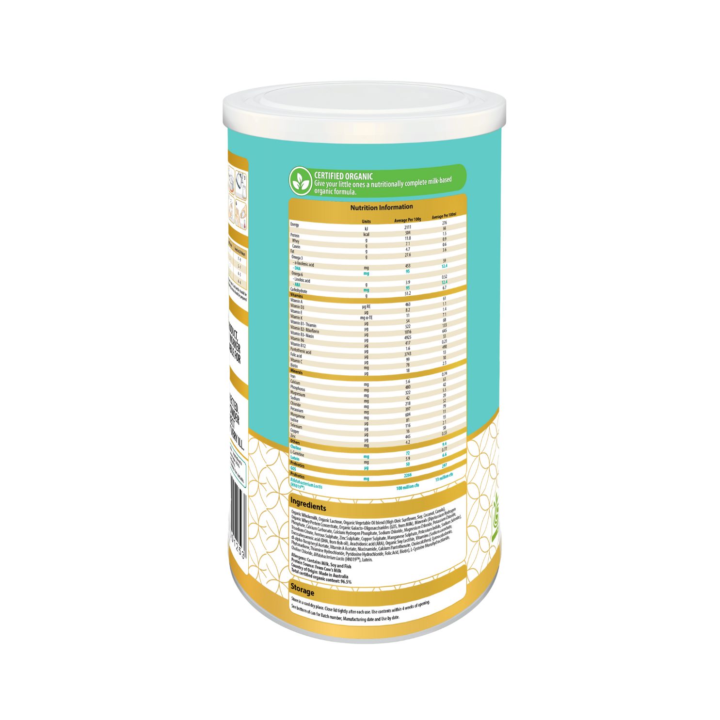 Organic Skimmilk Powder, Organic Wholemilk Powder, Organic Lactose, Organic Vegetable Oil blend (High Oleic Sunflower, Soy, Coconut, Canola), Organic Whey Protein Concentrate, Organic Galacto-oligosaccharides (GOS, from milk), Minerals (Dipotassium Hydrogen Phosphate, Calcium Carbonate, Calcium Hydrogen Phosphate, Sodium Chloride, Magnesium Chloride, Potassium Chloride, Trisodium Citrate, Ferrous Sulphate, Zinc Sulphate, Copper Sulphate, Manganese Sulphate, Potassium Iodide Sodium Selenite), Docosahexaenoic acid (DHA, from fish oil), Arachidonic Acid (ARA), Organic Soy Lecithin, Vitamins (Sodium ascorbate, dl-alpha-Tocopheryl Acetate, Vitamin A Acetate, Niacinamide, Calcium Pantothenate, Cholecalciferol, Cyanocobalamin, Thiamine Hydrochloride, Pyridoxine Hydrochloride, Folic Aid, Biotin), L-Cysteine Monohhydrochloride, Choline Chloride, Bifidobacterium Lactis (HNo19™), Lutein.